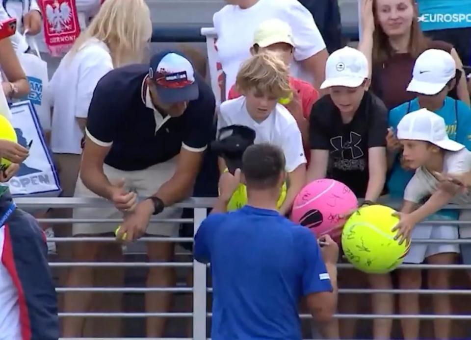 29岁的马伊赫扎克来自波兰,世界排名第76位。当地时间8月28日,他刚刚战胜了九号种子卡伦·卡恰诺夫。视频显示,马伊赫扎克在给场边观众签名网球时,顺手把帽子从头上摘下来打算送给面前的男孩,这时旁边一名男子一把抓住帽子并拿走,小男孩露出了失望和愤怒的表情。随后男子把帽子放进了站在他旁边的一名女子(后被证实是妻子)的包里。